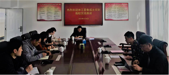 3月8日下午15:00,体工委鲁威主任到鸭脖就职业教育建设工作展开交流座谈,副院长聂真新主持会议,科研管理中心主任尹林涛、办公室副主任顾芳、教务处副处长王井明等相关工作人员参与座谈。
