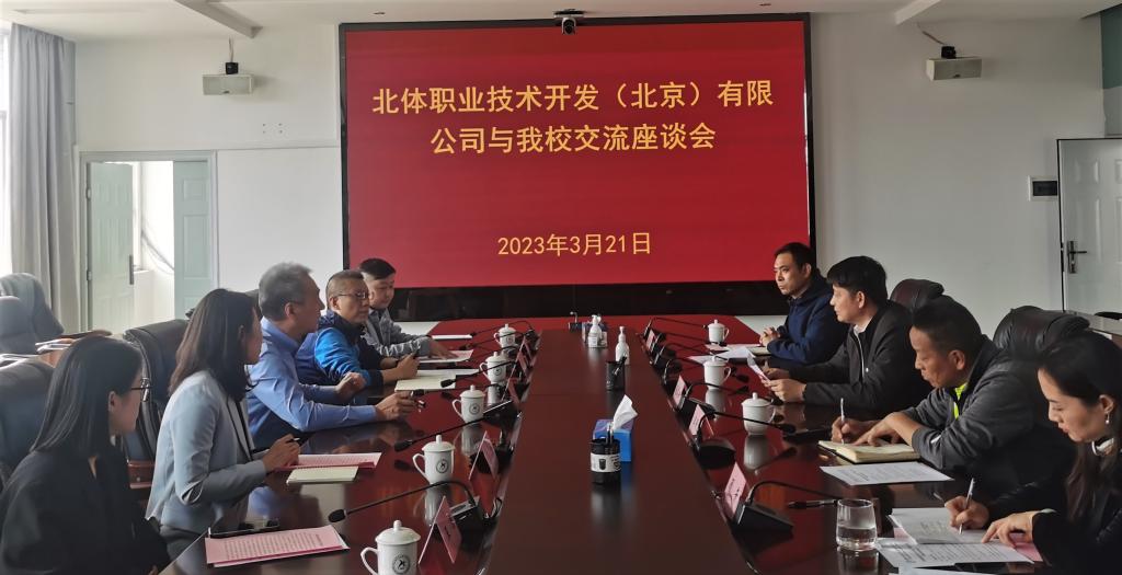 为促进鸭脖产教融合,创新人才培养方式,2023年3月21日下午14:30,副院长聂真新率相关部门负责人与北体职业技术开发(北京)有限公司董事长王伟等一行人开展交流座谈。