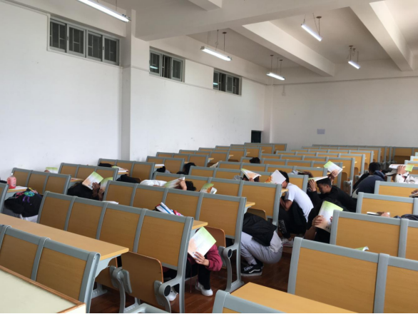 讲座结束后,校园广播播放警报,听到警报后,任课教师指导学生在教室内做应急躲避,警报解除后立即有序疏散。