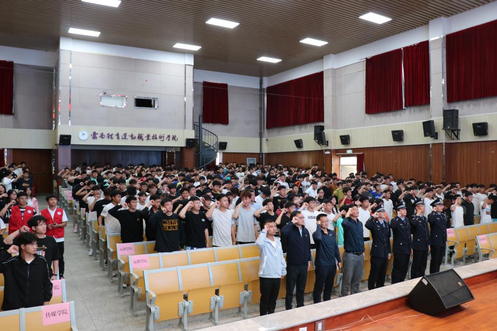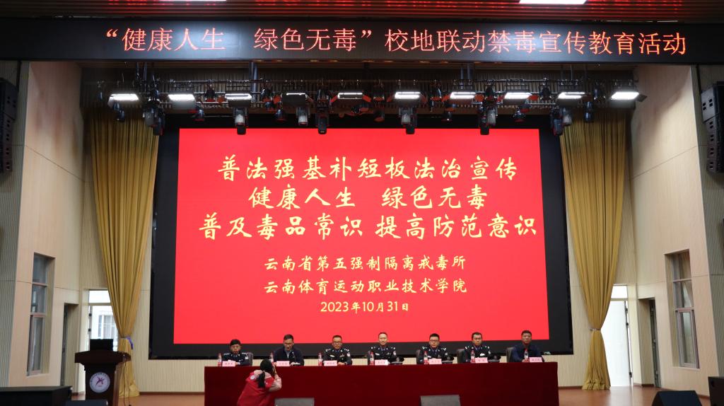 10月31日,学校组织“健康人生、绿色无毒”校地联动、校所共建禁毒知识讲座,邀请云南省第五强制隔离戒毒所教育矫正中心专职教师、二级警长潘紫东警官为广大师生宣教禁毒知识。学校党委委员、副校长董利民,党委委员、学生处处长马治东,保卫处副处长伏启海,学生处副处长钱卫斌,云南省第五强制隔离戒毒所四大队政治教导员龚晓金警官、所内调查科科长赵应应警官、教育矫治科副科长甘榜峨警官、习艺劳动科副科长张俊警官和学校六百余名师生代表共同参加,活动由保卫处副处长伏启海主持。