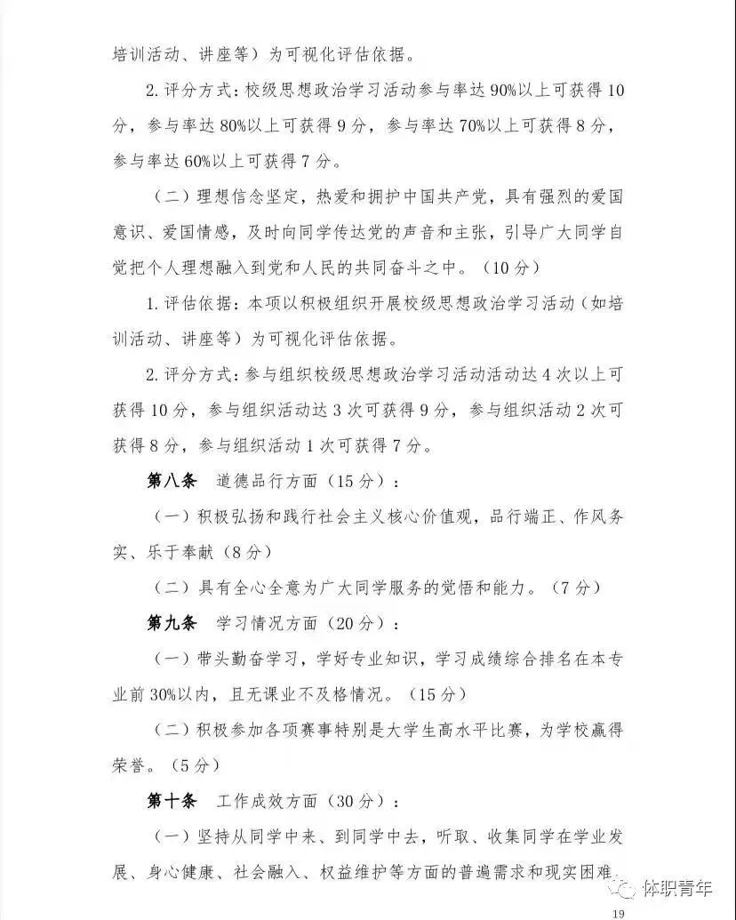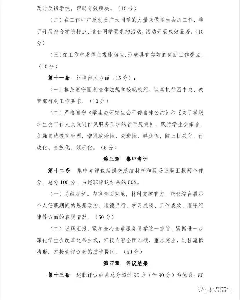 对学生会工作人员要严格执行考核制度,采取集中评议和日常考核相结合的方式,每学年组织一次集体评议会,评议会从政治思想、道德品行、学习情况、工作成效、纪律作风等方面对其进行全面客观的综合评价。对于违反校规校纪或严重扰乱学生会日常工作秩序,影响学生会形象的,将严肃按校规校纪处理。