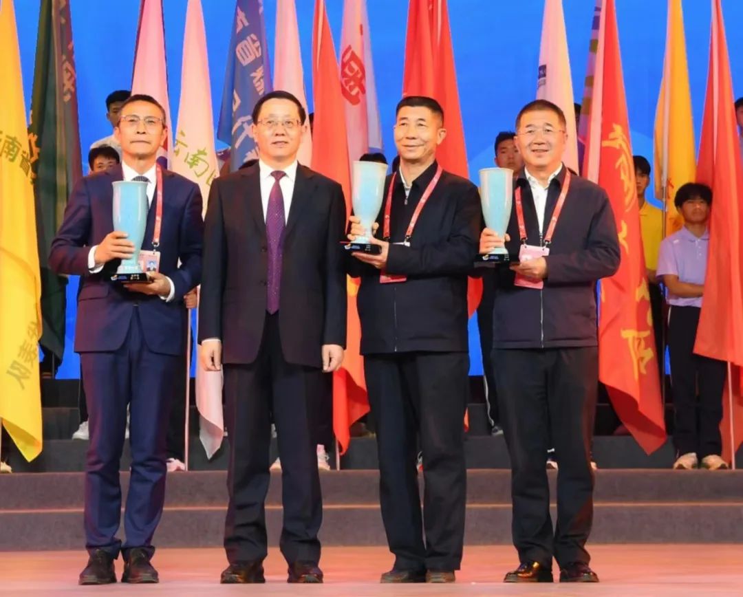 委副书记、省长王予波为本届运动会青少年组、大学组、职工组代表团奖牌总数第一名颁奖(图中左二为省委副书记、省长王予波,左三为我院院长代红兵)
