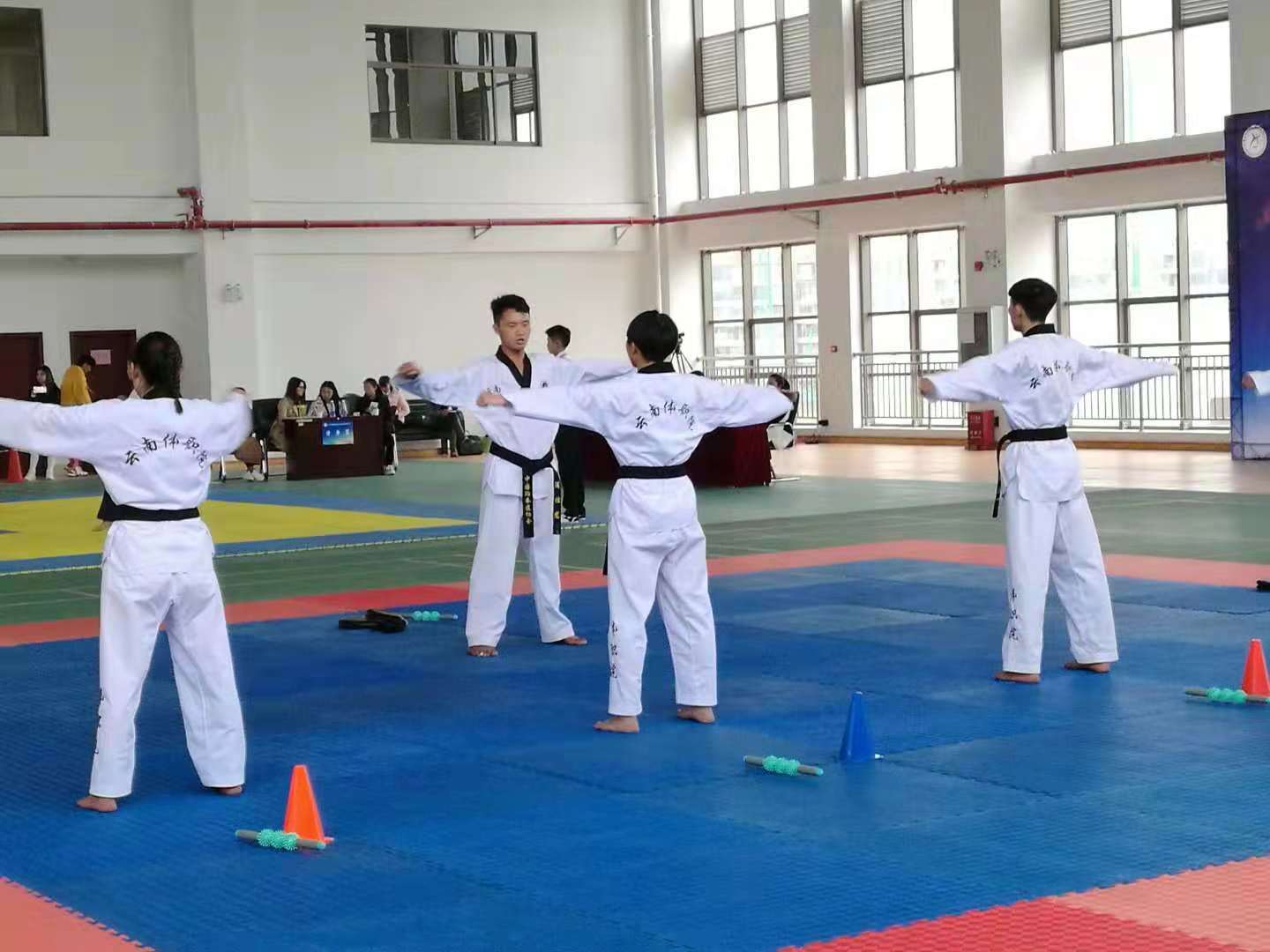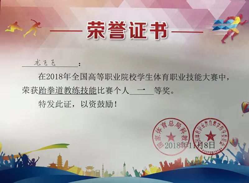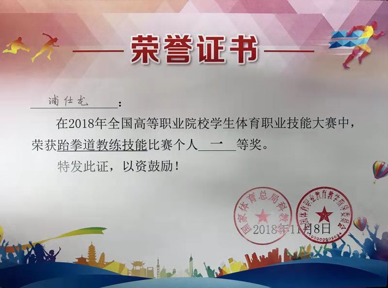 通过前期的刻苦训练,我院跆拳道代表队在比赛中取得了优异成绩。斩获了五个第一名的好成绩。分别是跆拳道教练技能比赛团体一等奖总分第一名,汤云鹏获得男子个人一等奖个人成绩第一名,浦仕龙获得男子个人一等奖个人成绩第三名,王储获得女子个人一等奖个人成绩第三名,龙飞飞获得女子个人一等奖个人成绩第四名的好成绩。此外,汤江云、杨爽,李祥枢获得了优秀指导教师的称号。