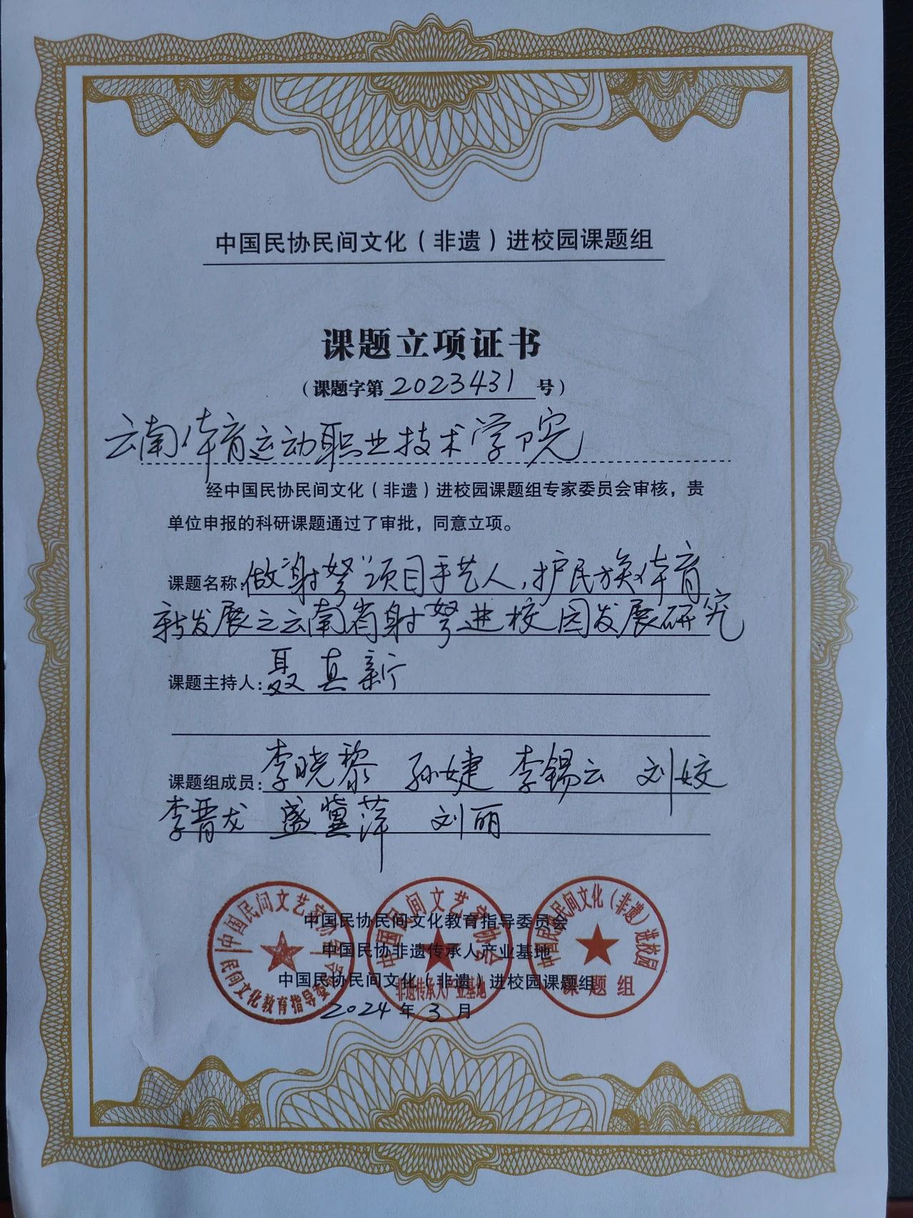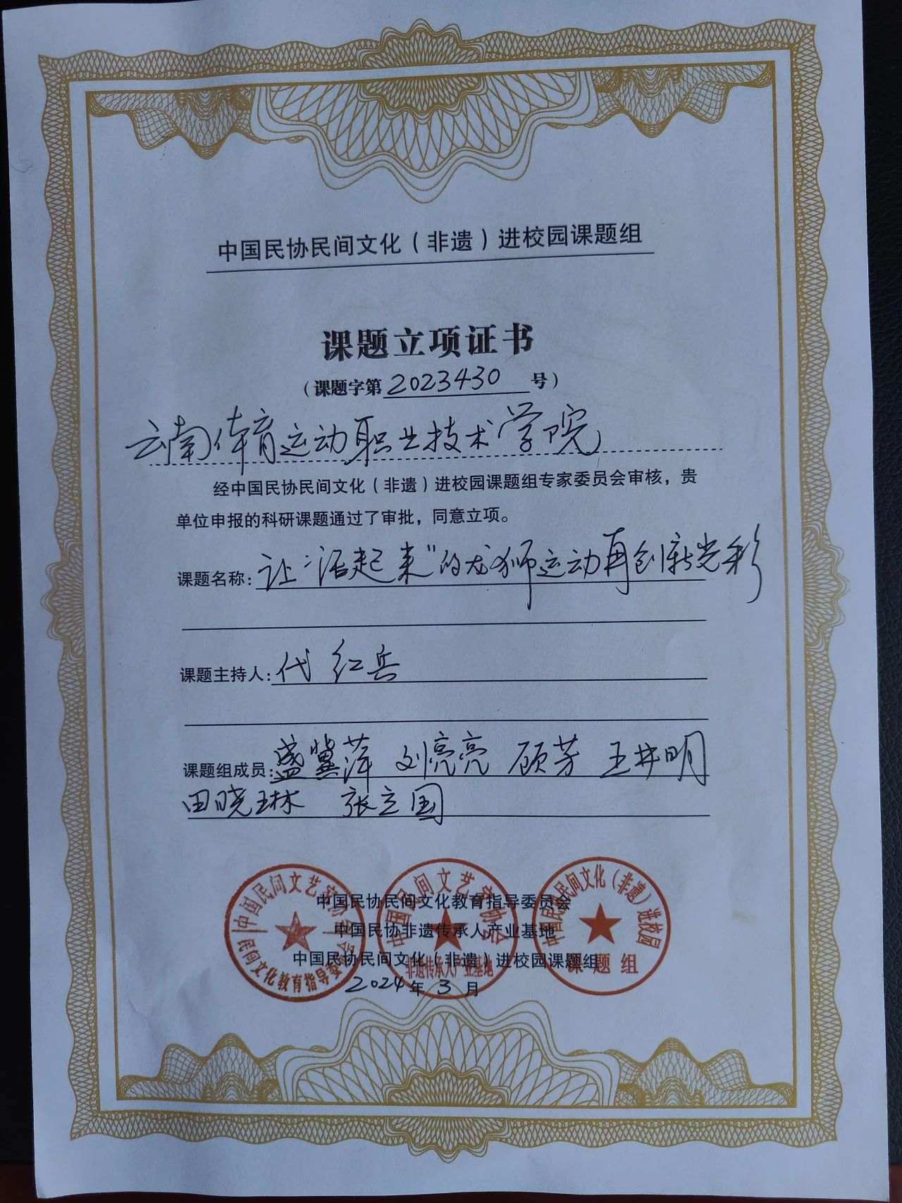 近日,由中国民间文艺家协会指导,中国文联民间文艺艺术中心、中国民协民间文化教育指导委员会、中国民协非遗传承人产业基地三家单位承办的中国民协“民间文化(非遗)进校园”科研课题进行了立项单位公示,鸭脖党委副书记、校长代红兵主持的《让“活起来”的龙狮运动再创新光彩》,党委委员、副校长聂真新主持的《做“射弩”项目手艺人,护民族体育新发展之云南省射弩进校园发展研究》成功立项。