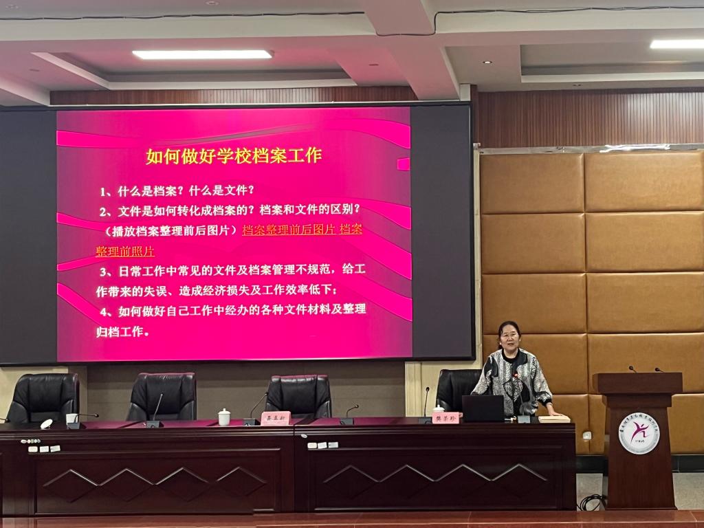 第二阶段,云南省档案馆建设专家樊荣珍老师对学校全体兼职档案员开展档案工作培训。樊老师围绕“什么是档案”“如何做好档案工作”等问题向在座老师授课,对档案工作相关法律法规、归档部门兼职档案员职责和规范化处理档案的基本操作办法进行了详细讲述,以丰富的档案管理经验对实际案例做了深入剖析,课后并对老师的相关问题答疑解惑。