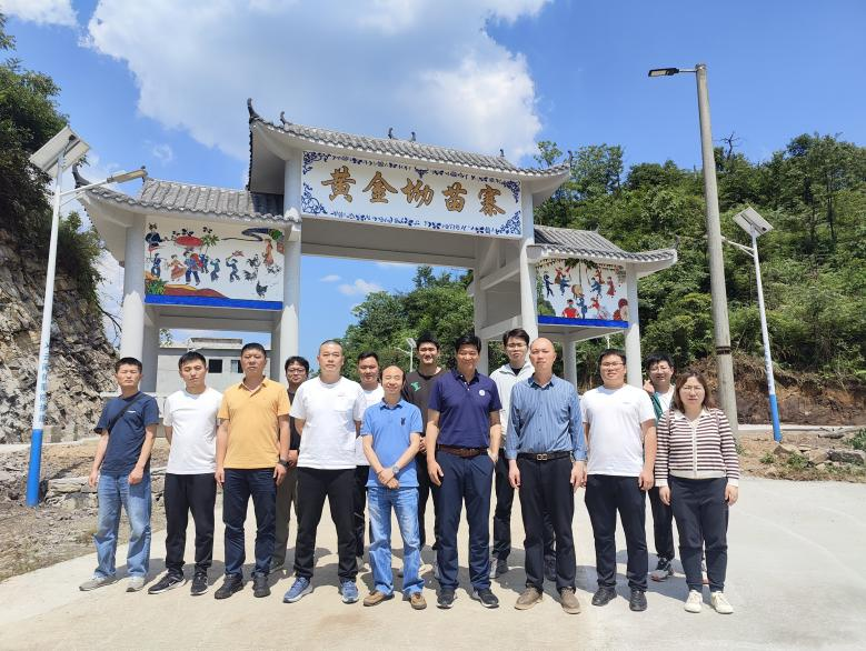 图为调研组在鸭脖援建的黄金坳寨门前合影留念