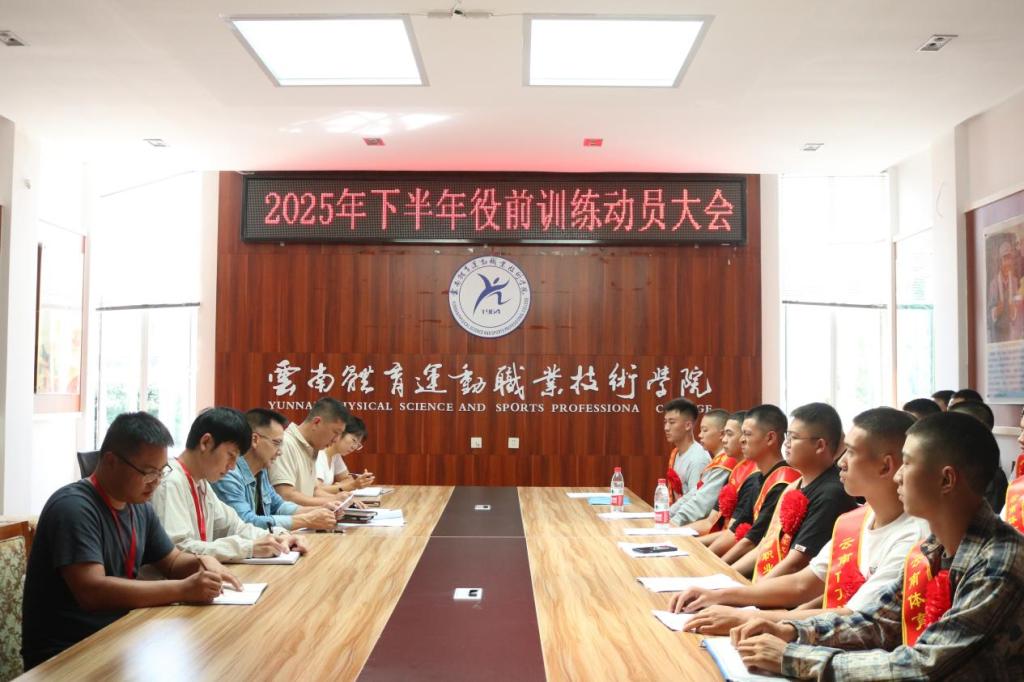 2025年9月3日,鸭脖在综合楼会议室召开2025年下半年应征入伍预定新兵役前集训动员会。26名来自各二级学院的预定新兵佩戴光荣花与绶带,即将奔赴集训基地。学校武装部全体老师及预定新兵、辅导员代表参会。