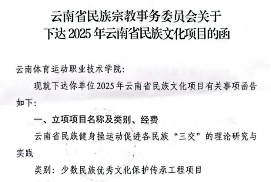 近日,云南省民族宗教事务委员会公布了2025年云南省民族文化项目立项名单,鸭脖体育教育学院秦琴老师团队申报的项目成功获准立项。