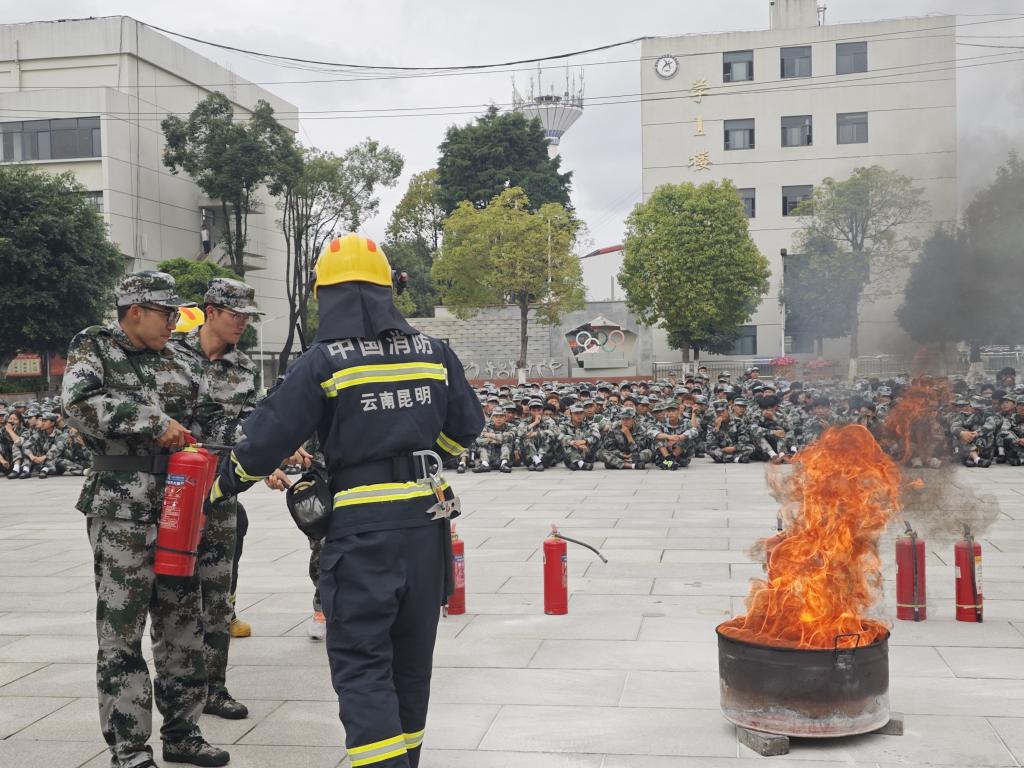 消防演练环节中,随着急促的警铃声响起,全体新生在宿管和承训教官的指引下,按照火场逃生的规范及动作要领,快速、有序地疏散到室外空旷地带。结束后,官渡区消防救援大队的教员首先向全体师生展示火场灭火、救援实操等模拟演练内容。其次,深入讲解手提式干粉灭火器、室内消火栓箱、灭火毯、防毒面具等消防器材的使用方式,以及日常生活中如何防范消防安全隐患并正确处置突发情况。最后,指导学生正确使用灭火器并开展灭火实操。