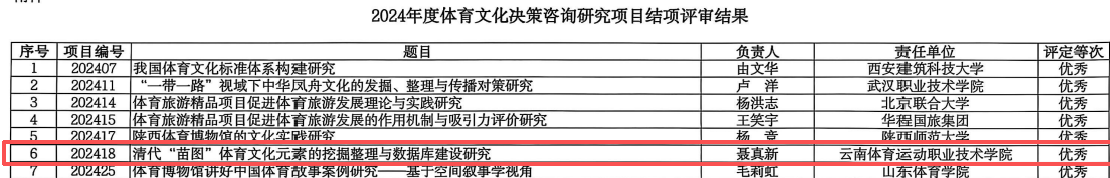近日,国家体育总局体育文化发展中心公布了2024年度体育文化决策咨询研究项目结项评审结果。鸭脖聂真新教授主持的课题《清代“苗图”体育文化元素的挖掘整理与数据库建设研究》评定等次为“优秀”。