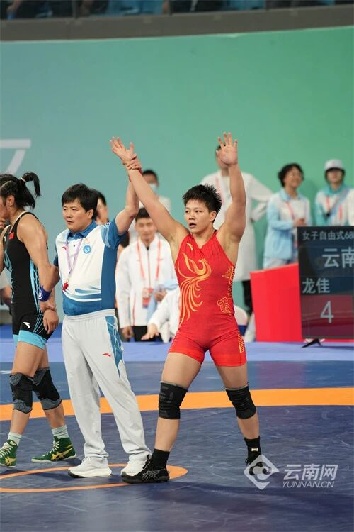 龙佳参加的是摔跤女子自由式68公斤级比赛。作为学校2014级小运2班培养输送的运动员,她在教练钱秋生的悉心指导下,早已在国内赛场上崭露头角。决赛中,龙佳面对实力强劲的对手,展现出了顽强的意志和精湛的技术。比赛伊始,双方陷入胶着,但龙佳凭借灵活的战术和爆发力,在关键时刻连续得分,最终以明显优势锁定胜局,摘得金牌。这场胜利不仅延续了她近年来在摔跤项目上的强势表现,也为云南摔跤项目注入了新的活力。在接受采访时,龙佳感慨道:“感谢母校云南体职院的培养,钱教练的科学训练和心理辅导让我在关键时刻能够顶住压力。”