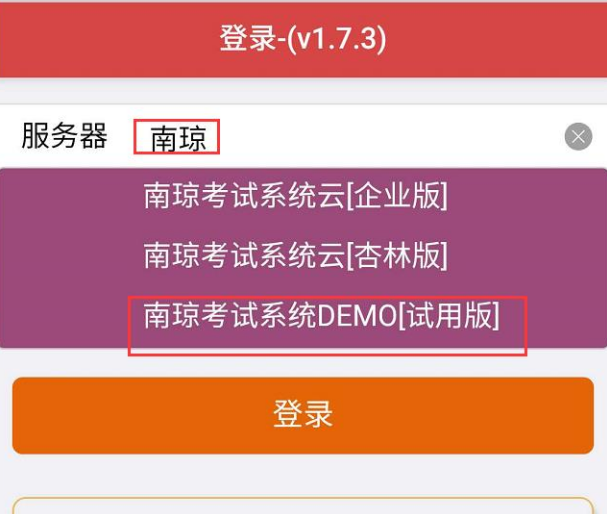3、在服务器中 输入【南琼】,选择【南琼考试系统DEMO试用版】