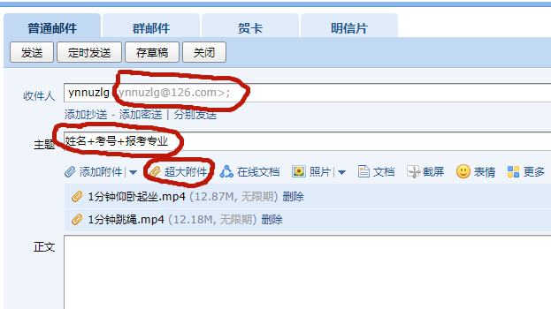 开始考试前,考生手持身份证于胸前置于镜头内、身份证信息和头像清晰可见,报告自己的姓名及准考证号、报考专业。服装方面要求穿着运动服,款式和颜色不限。每段视频长度控制在1.5分钟以内,文件小于50M,文件格式为MP4,视频分辨率不低于960*544,两个视频文件分别命名为:1分钟跳绳、1分钟仰卧起坐(先后顺序不限)。视频文件一律采用QQ邮箱超大附件模式发送,视频录制现场要求安静且采光良好,测试内容的视频必须完整,视频不允许有剪辑或者修改等痕迹,要求一次录制完成,考生可多次录制,选取自己认为最好的一次上传邮件,发送视频邮件地址为:ynnuzlg@126.com: