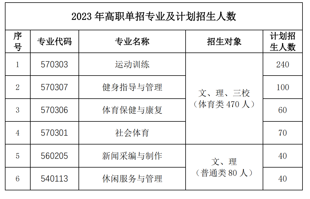 2023年鸭脖高职单招计划招生550人,各专业具体招生名额以上级实际下达计划数量为准;计划6个专业面向高职单招考生招生,其中普通类专业2个:新闻采编与制作、休闲服务与管理;体育类专业4个:运动训练、健身指导与管理、体育保健与康复、社会体育。