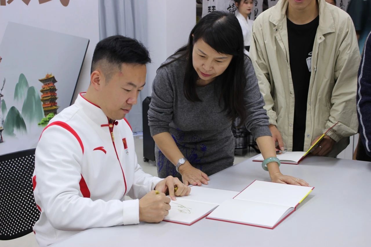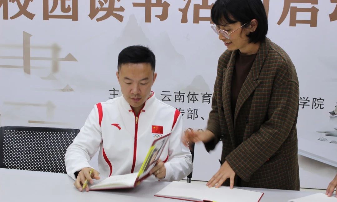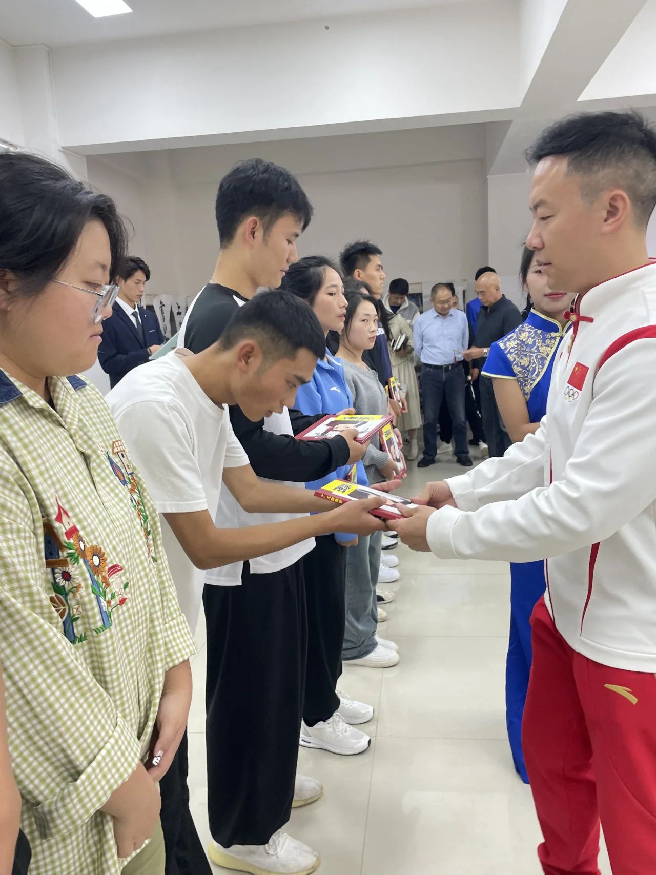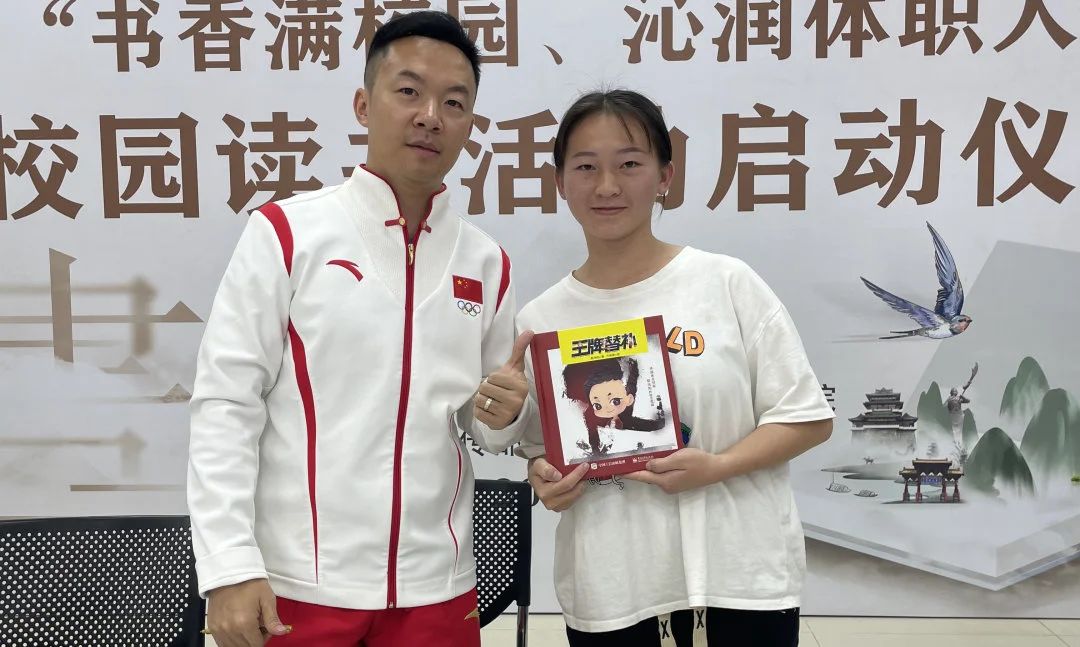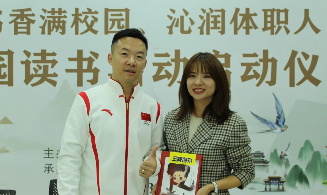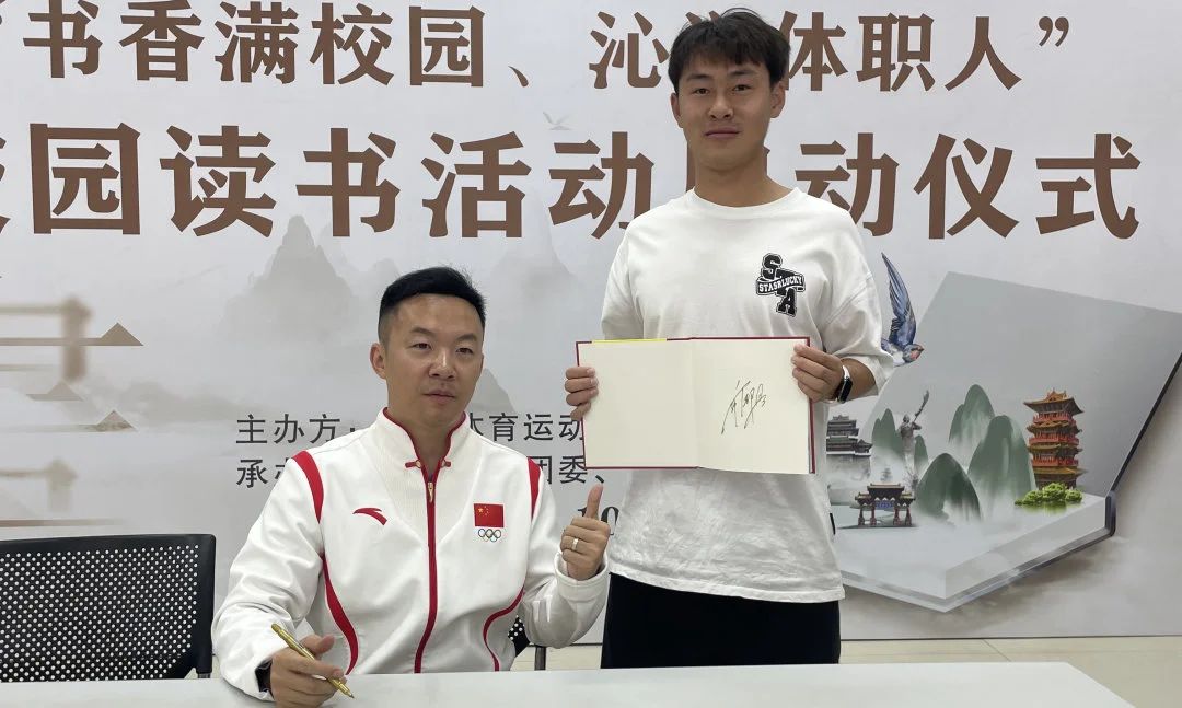 体操奥运冠军郭伟阳在启动仪式上向学生代表们签赠漫画自传书《王牌替补》。随后向同学们推荐了《习近平的七年知青岁月》和《运动改造大脑》两本书,希望同学们能通过阅读这两本书从不同的维度、不同的人物故事去学习,将来成为一个能文能武的人才。他强调要感谢学校的栽培让自己能有今天的成就并且站在这里与同学们面对面交流,希望同学们能珍惜在校时光,不断通过阅读充实自己。