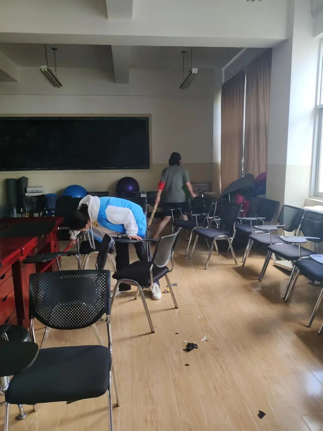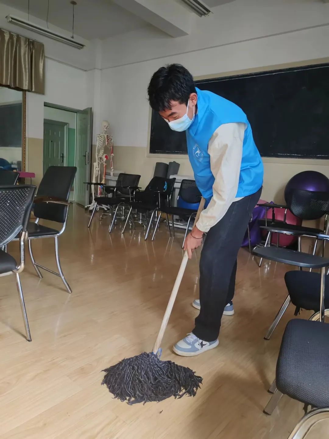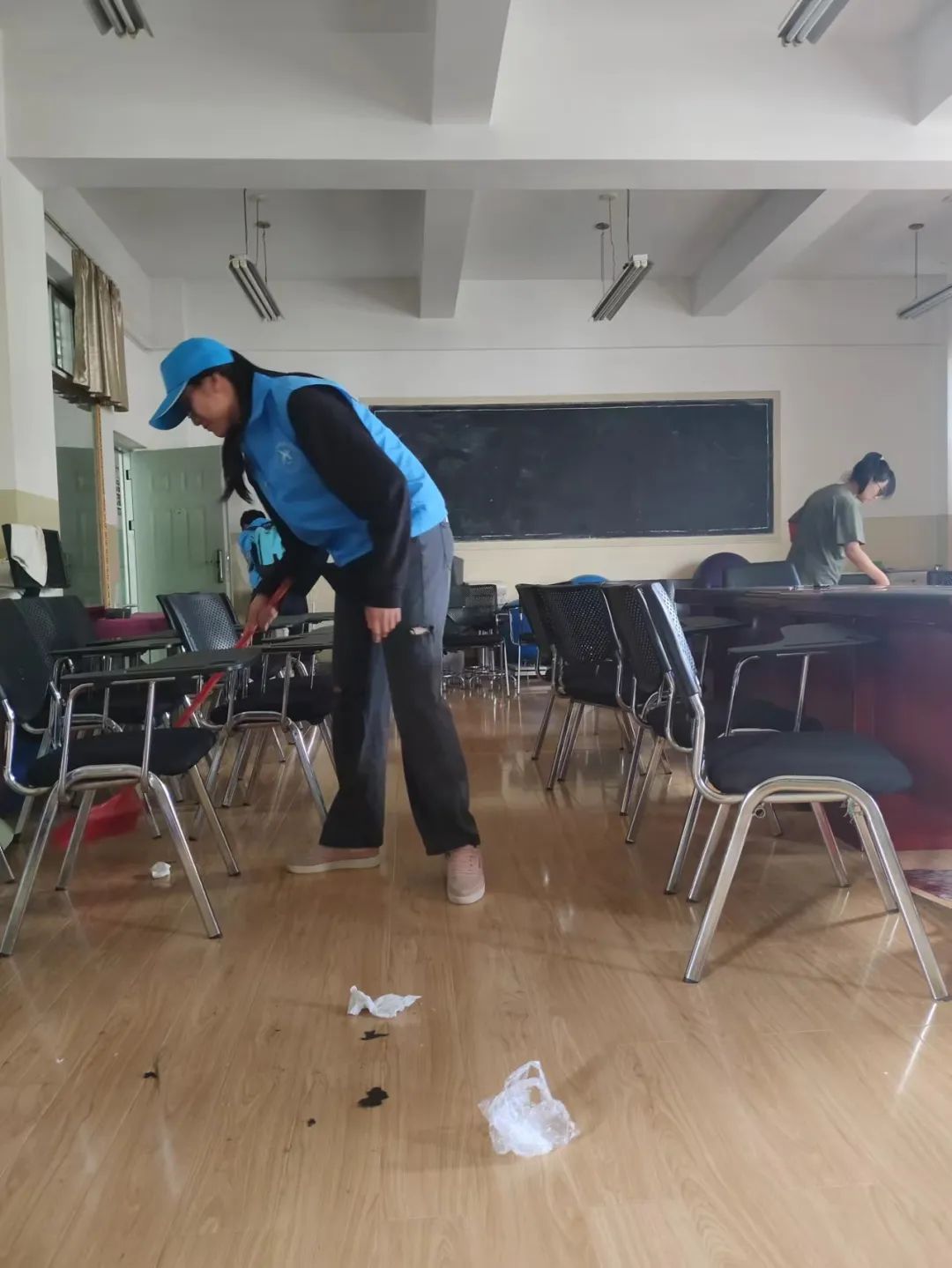 无论是教室、广场、球场,都能看见他们的身影。志愿者们分工明确,扫地、收垃圾、拖地,勤勤恳恳的在为学校的环境做贡献。
