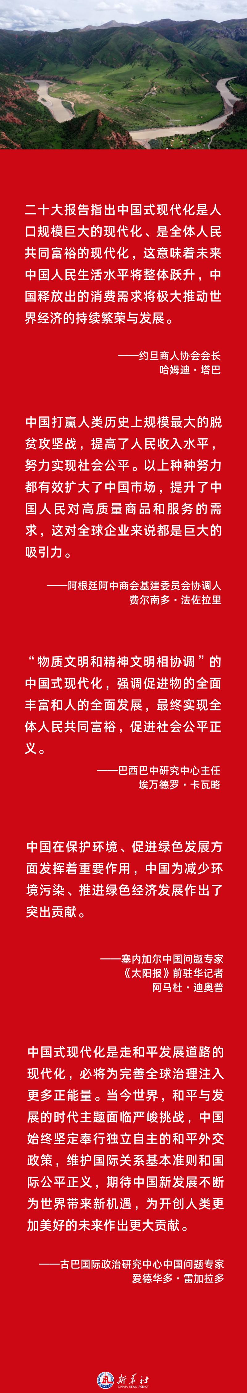 二十大报告指出,中国式现代化是人口规模巨大的现代化;是全体人民共同富裕的现代化;是物质文明和精神文明相协调的现代化;是人与自然和谐共生的现代化;是走和平发展道路的现代化。海外人士认为,中国式现代化拥有丰富内涵和强大吸引力,将积极推动世界繁荣、文明互鉴,为世界注入更多正能量。
