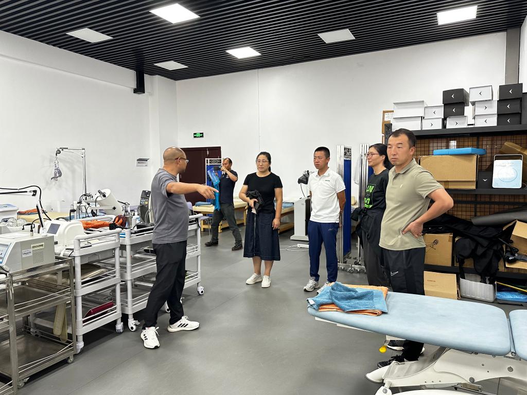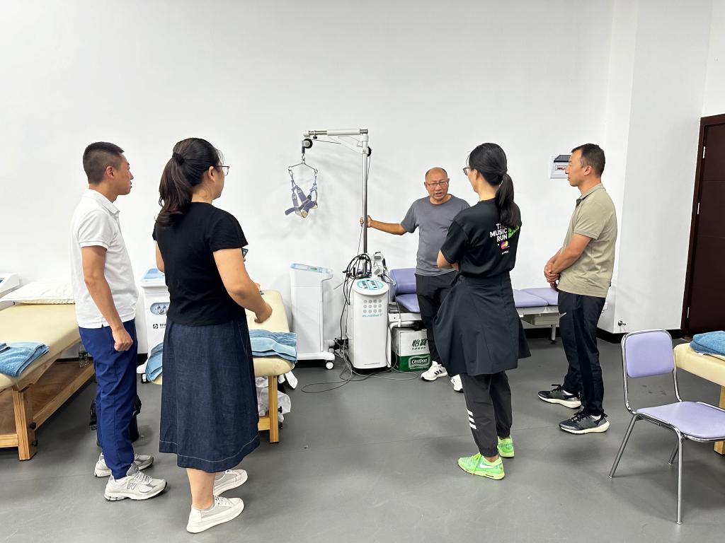 在康复中心负责人的陪同下,学院一行参观了综合训练中心的运动康复区、物理治疗室以及再生恢复区。中心负责人详细介绍了综合训练中心的运作模式、治疗技术以及先进物理治疗设备。