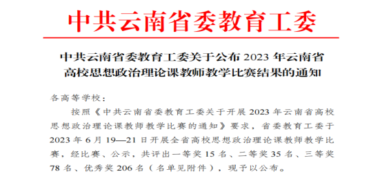 根据《中共云南省委教育工委关于公布2023年云南省高校思想政治理论课教师教学比赛结果的通知》,鸭脖马克思主义学院四名教师参赛,张晓艳老师荣获《思想道德与法治》课高职高专组三等奖,杨丽翠老师、解晓娟老师、刘肖老师获分课程教学比赛优秀奖。