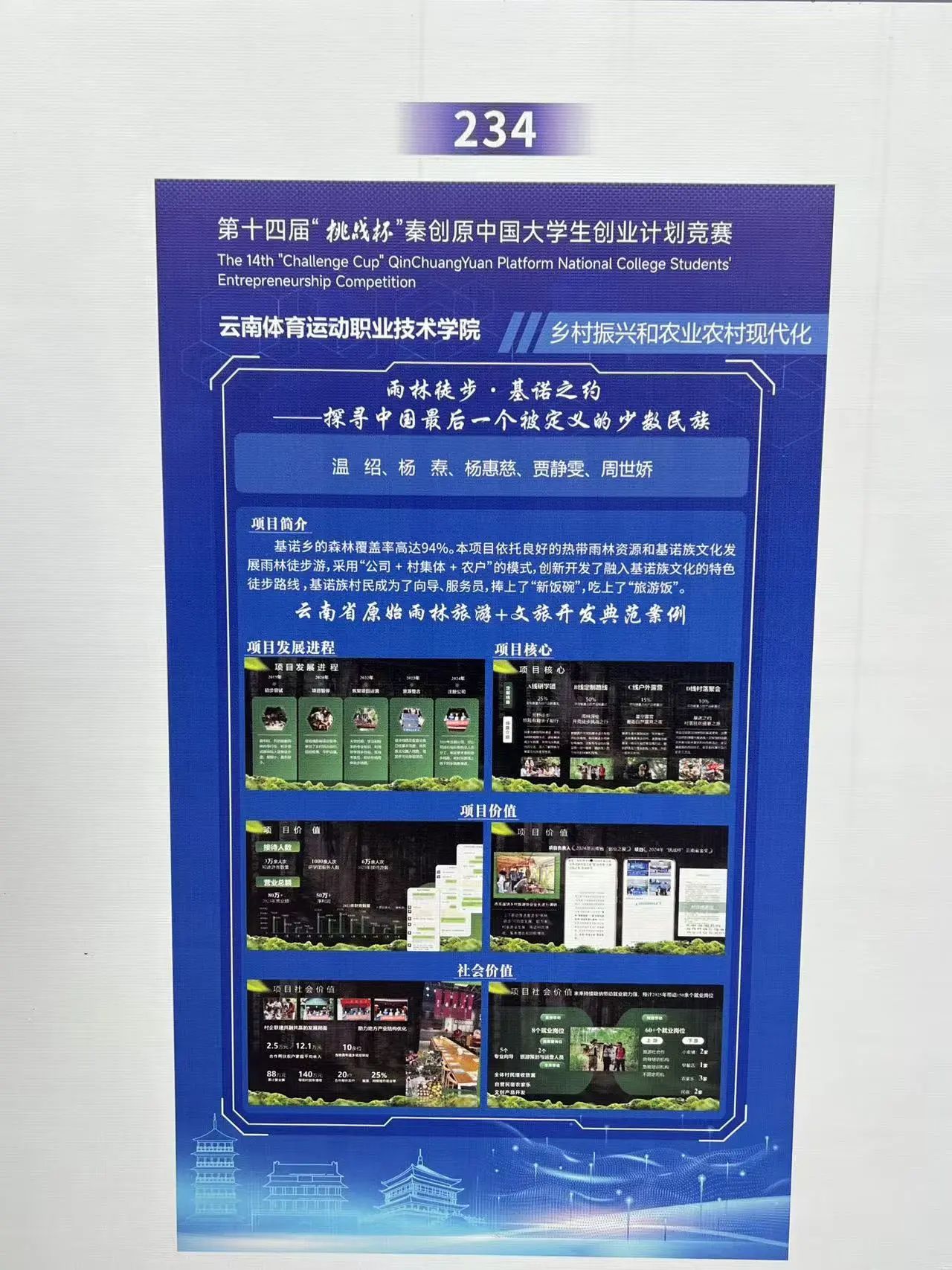 2024年11月2日,由共青团中央、教育部、人力资源社会保障部、中国科协、全国学联和陕西省人民政府联合主办,西安交通大学、共青团陕西省委承办的第十四届“挑战杯”中国大学生创业计划竞赛在西安落下帷幕。鸭脖报送项目“雨林徒步·基诺之约——探寻中国最后一个被定义的少数民族”荣获主体赛银奖。该成绩是“挑战杯”系列竞赛中学校最好成绩,系学校创新创业教育工作的重大突破。