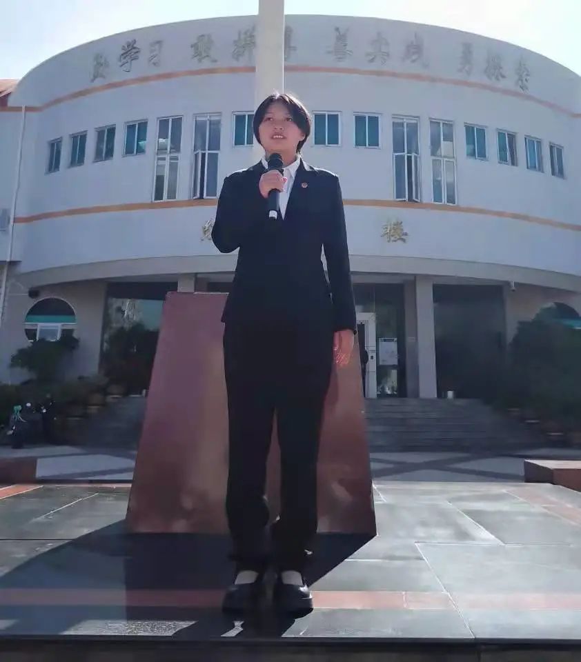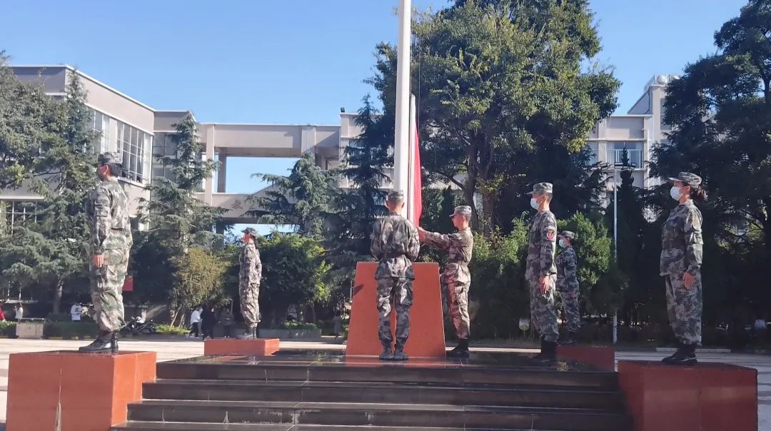 在主持人宣布升旗仪式开始后,国旗护卫队将国旗护送至旗杆下,全体肃立,《义勇军进行曲》响起,嘹亮的歌声响彻整个校园,鲜艳的五星红旗在蔚蓝的天空下迎风飘扬。