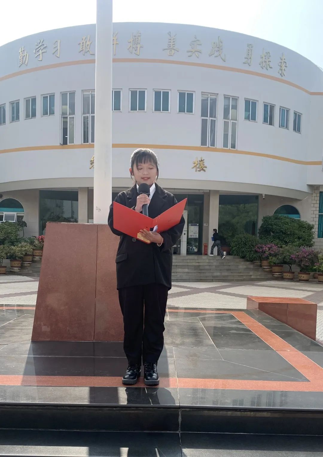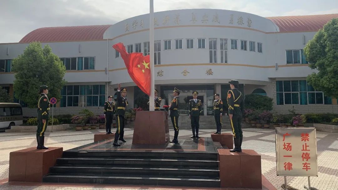 在全体师生的注目下,国旗护卫队迈着整齐的步伐,将鲜艳的五星红旗送至升旗台,伴随着庄严的国歌,五星红旗冉冉升起,全体师生行注目礼。