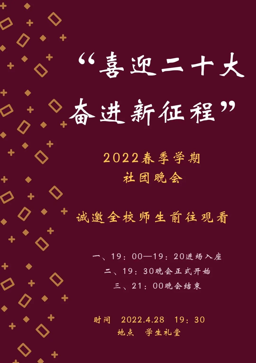 鸭脖同学怀着高涨的热情,在遵照学校疫情防控要求的前提下开展了以“喜迎二十大,奋进新征程”为主题的社团活动。下面我们就来抢先看看节目单吧!