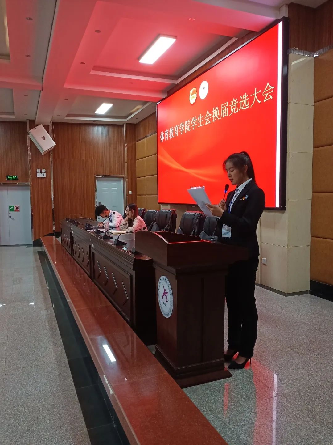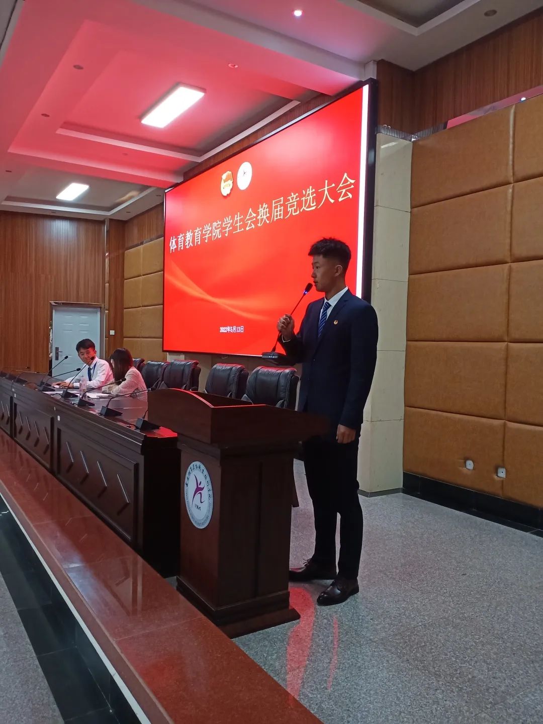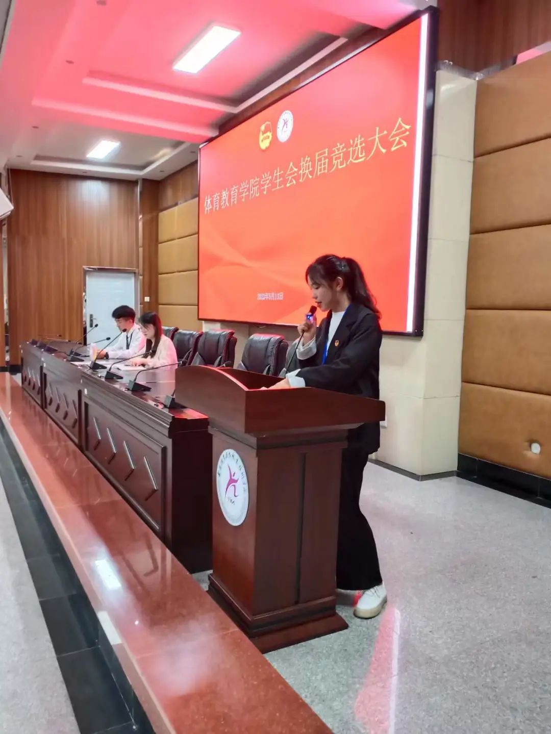 体育教育学院团总支书记耿玮老师、学生会全体成员、体教学院各班班委及班级代表到场聆听并进行了投票。本次换届共有6名同学参与主席团成员竞选,大会共分为三个环节。