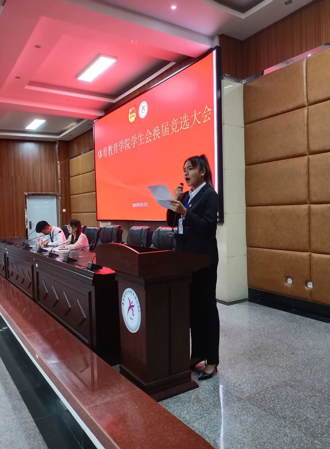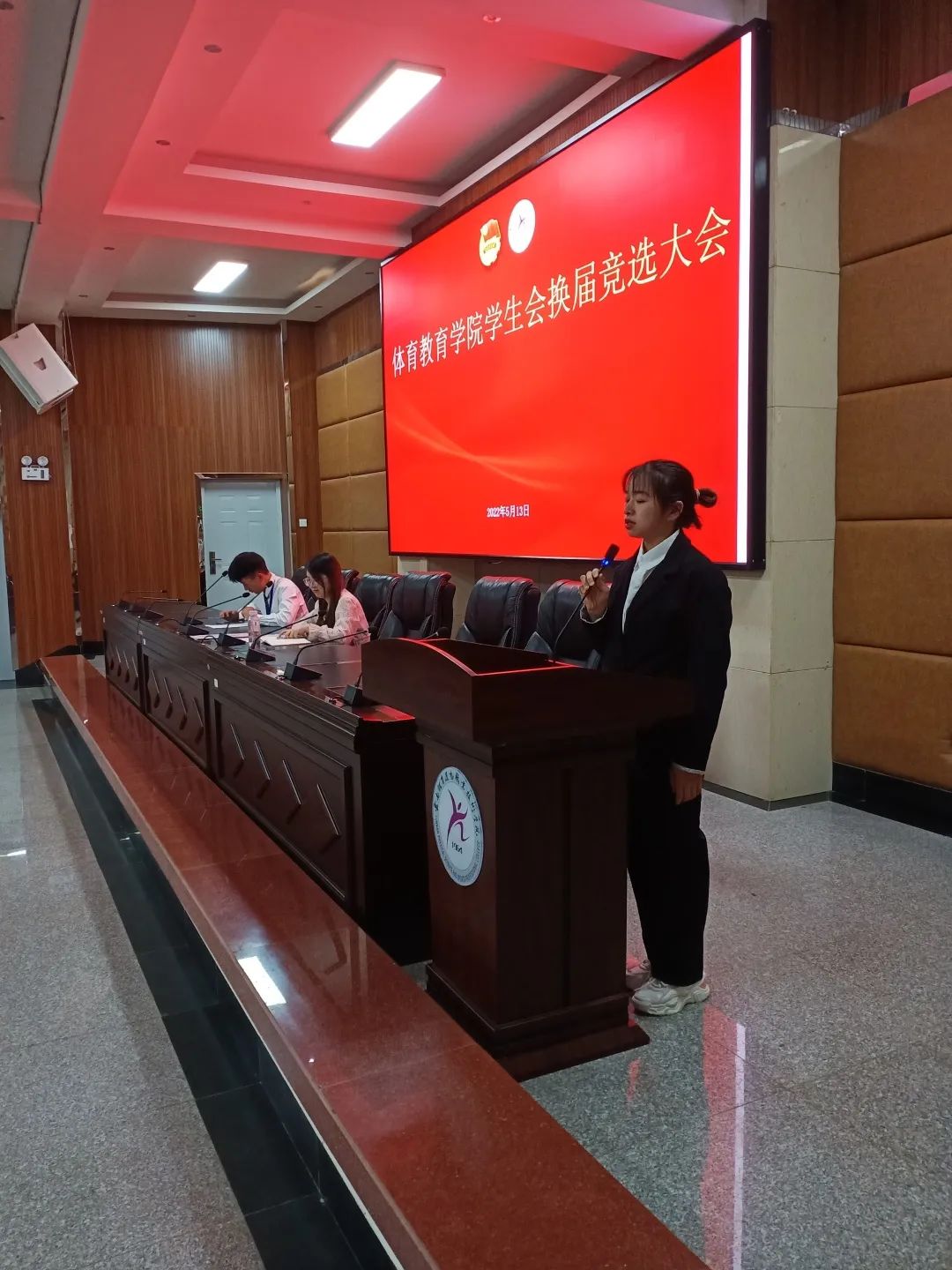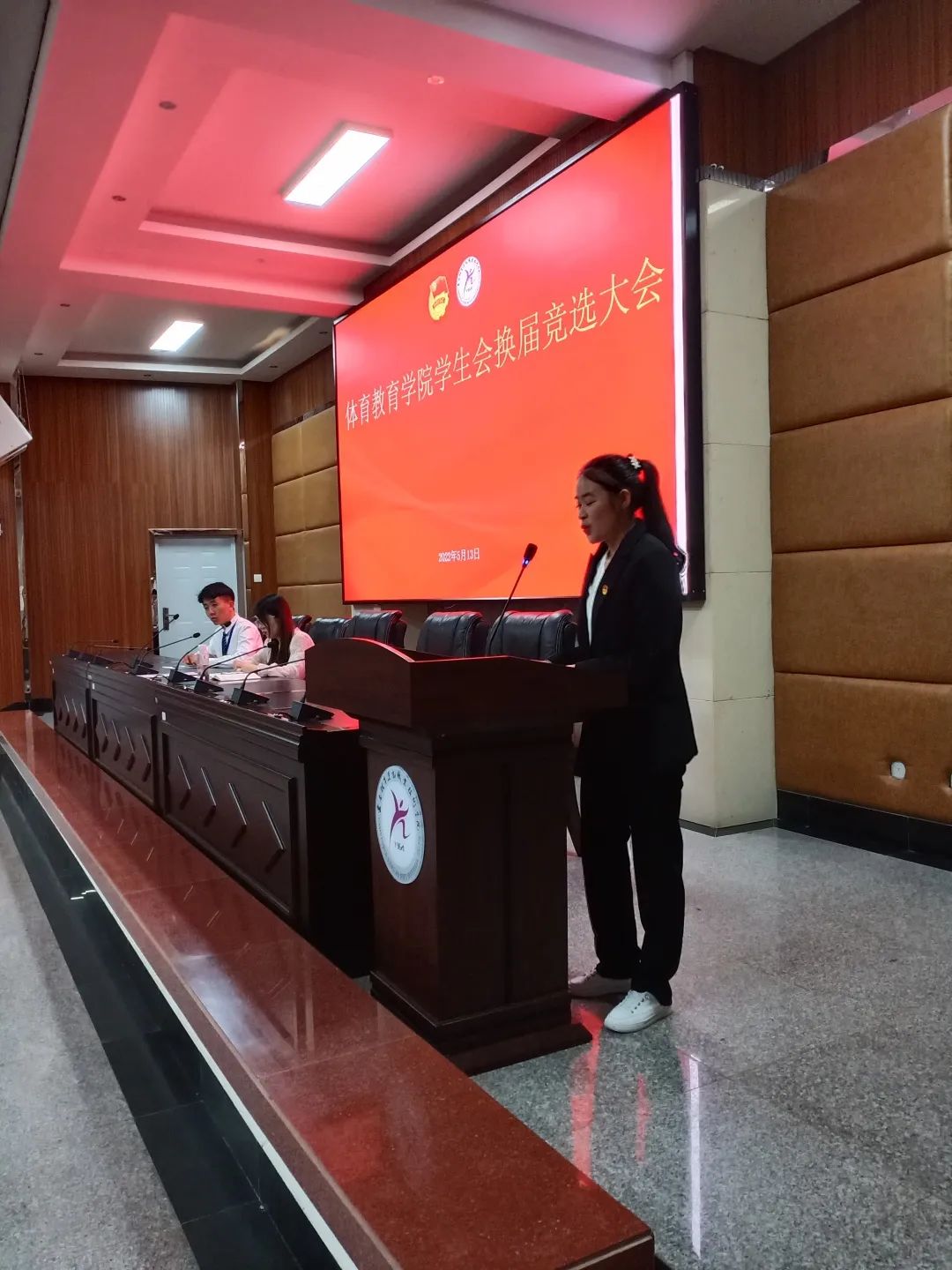 体育教育学院团总支书记耿玮老师、学生会全体成员、体教学院各班班委及班级代表到场聆听并进行了投票。本次换届共有6名同学参与主席团成员竞选,大会共分为三个环节。