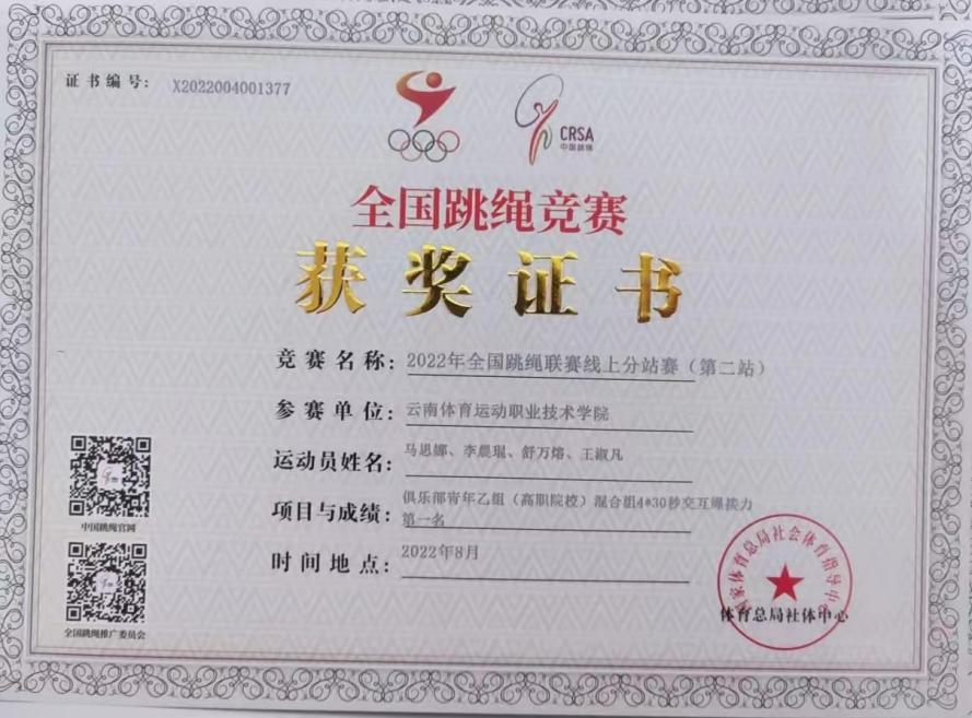 21级电子信息工程技术团支部王淑凡同学参加了由国家体育总局社会体育指导中心主办的全国跳绳联赛,荣获俱乐部青年乙组(高职院校)混合组4*30秒交互绳接力第一名。