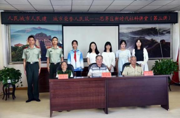 施维伶同学(图二中右二)参与了思茅区新时代社科讲堂第三讲,讲述了思普军民拦河围坝建成今天的洗马河水库的故事,讲述了三位老兵从立志参军到退役后投身改革发展、服务乡村振兴、与思普人民共同奋斗的感人事迹,施维伶同学积极帮助准备活动的顺利开展,并作为大学生代表发言。
