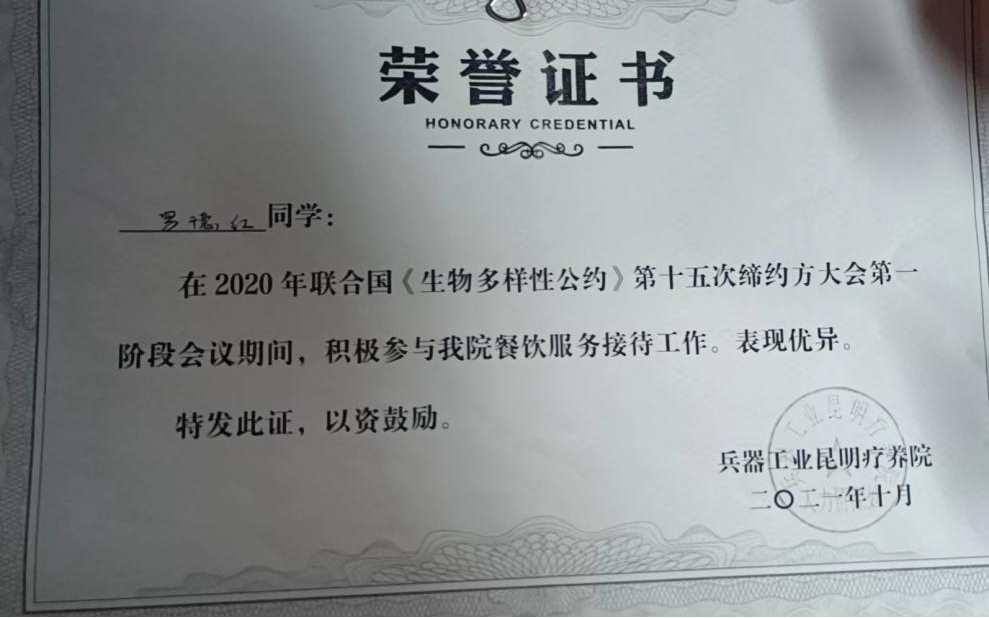 为做好联合国《生物多样性公约》第十五次缔约方大会筹备工作,牢固树立创新、协调、绿色、开放、共享的发展理念,共同保护生物多样性,提升云南国际知名度,向世界展示云南之美,罗德红同学在会议期间作为志愿者参与了餐饮服务接待工作,表现优异。