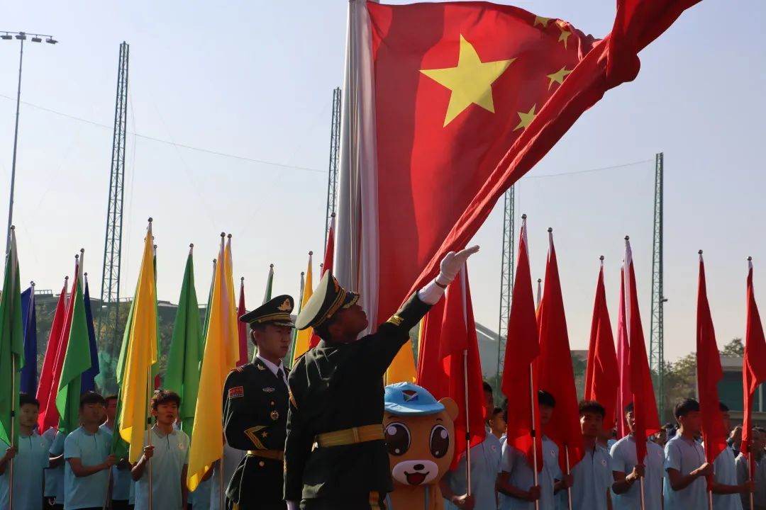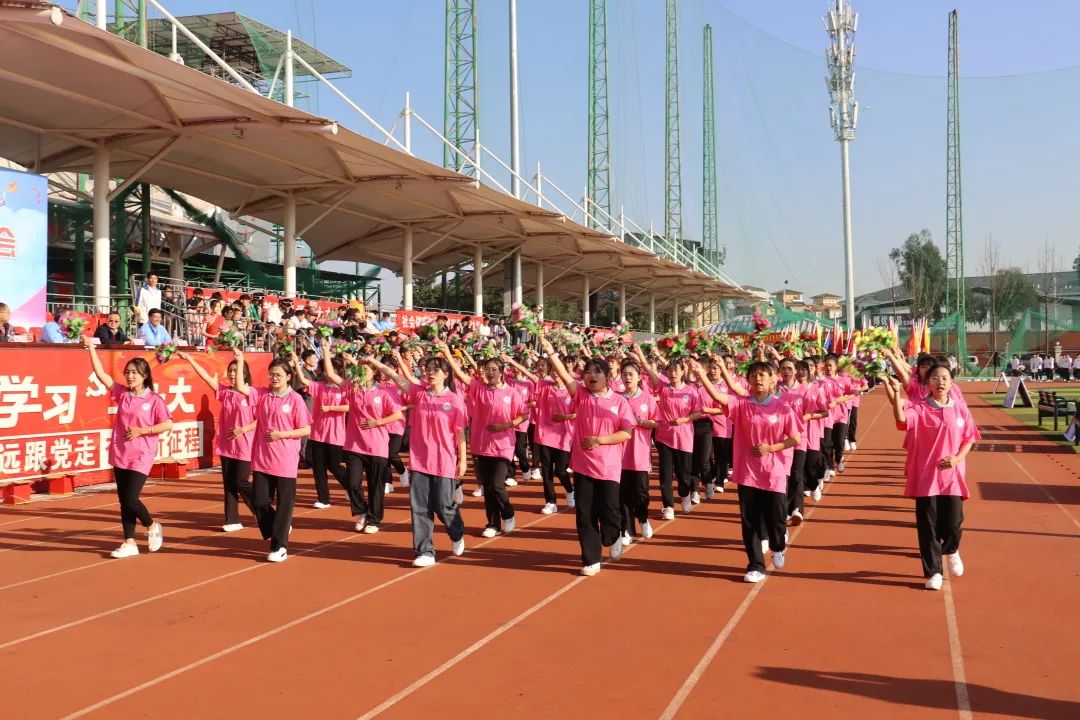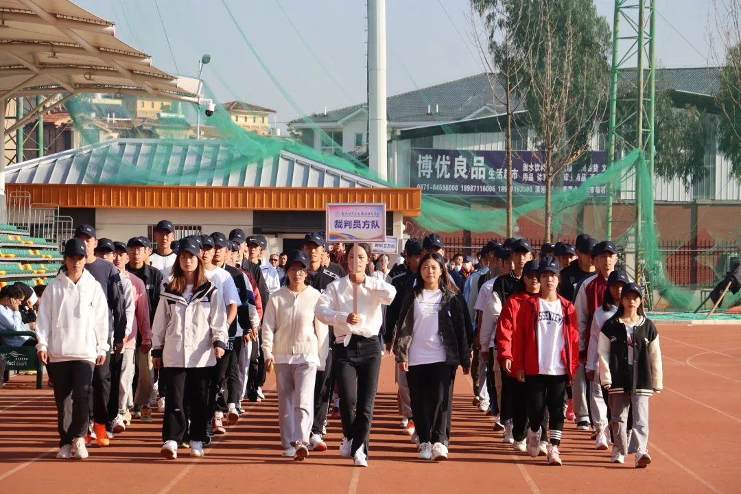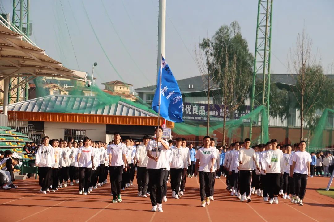 开幕式现场,国旗队、校旗队、鲜花队、彩旗队、各学院运动员代表方队、裁判员方队、教职工方队依次入场,英姿飒爽、昂首阔步、口号铿锵。