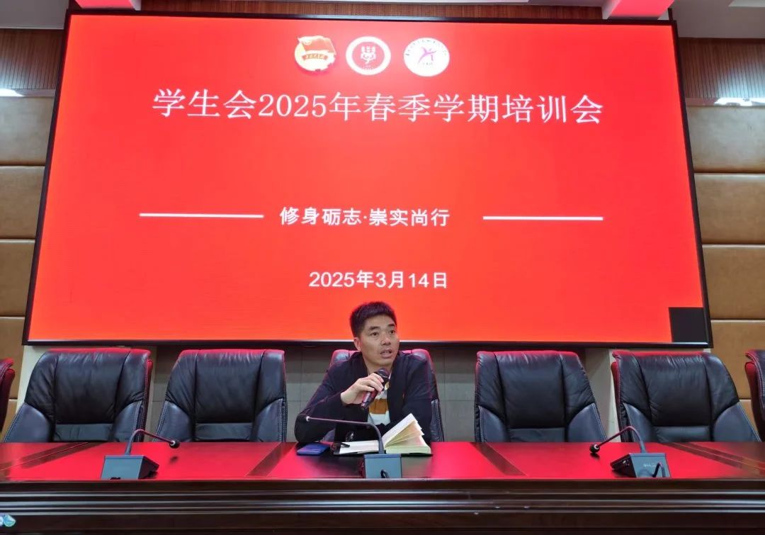 校团委书记陈明照代表学校团委充分肯定了学生会在过去一年取得的成绩,特别是其“打造让同学们想得起、找得到、信得过的学生会”项目,不仅成功入选了全国100个精品项目,而且还荣获了“优秀项目”的称号。在此基础上,陈明照书记向参加本次培训会的同学提出了以下几点殷切希望:一、善于学习:应善于学习国家政策和专业技能,以提升自己的综合素质。学习的内容不仅限于书本知识,还应包括学习习近平总书记的思想,深刻领会党的理论和路线方针政策,此外,学习还应涵盖学技能和学做人,掌握实用的专业技能,并培养良好的道德品质和社会责任感。二、勤于思考:他鼓励学生勤于思考,思考在学校应该做的事情,如学业、社团活动、志愿服务等,以明确自己的责任和使命。同时思考自己大学应该有的人生规划,包括学业目标、职业规划、个人成长等方面。更重要的是,要思考自己的将来发展,明确自己的职业方向和人生目标,为未来的学习和工作打下坚实的基础。三、乐于行动:他鼓励学生将所学积极应用于实践中。行动不仅体现在身体上的行动,如参加实践活动、完成工作任务等,还体现在思想上的行动,如积极思考问题、主动寻求解决方案等。学生应通过实际行动来检验和提升自己所学知识和技能,同时勇于创新和实践,为学生会打造更多品牌项目贡献力量。