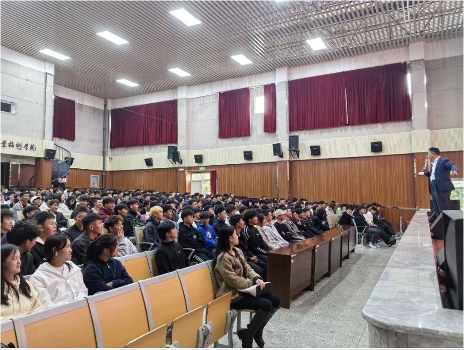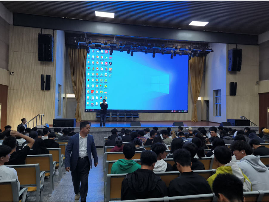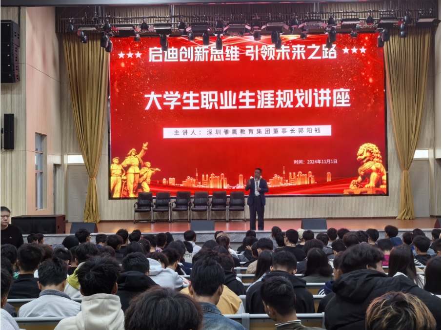 讲座现场气氛热烈,大一新生们怀揣着对未来的憧憬与好奇,全神贯注地聆听郭阳钰的分享。他以亲切且生动的口吻,详细讲述了自己在创业道路上的点点滴滴,从最初的创业构想萌芽,到遭遇重重困难与挑战时的坚持与抉择,再到逐步将雏鹰教育集团发展壮大的历程。他用真实的故事和宝贵的经验,让同学们深刻感受到了创业之路的艰辛与魅力,也让大家认识到在职业生涯规划中,明确目标、坚定信念以及具备应对挫折的勇气是何等重要。