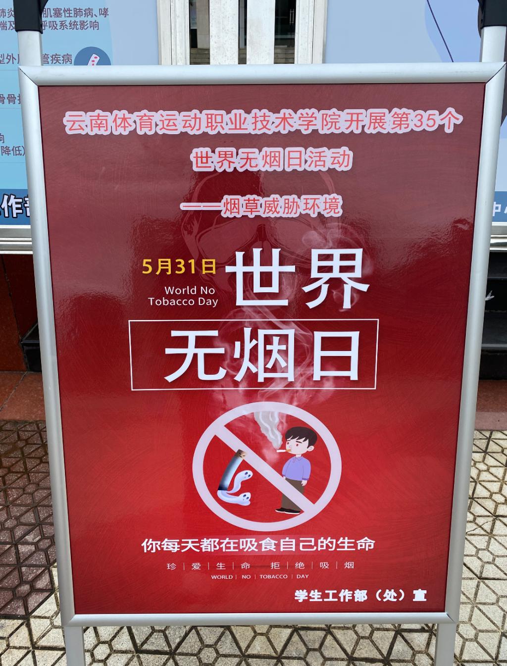 2022年5月31日学校开展了第35个世界无烟日主题宣传活动,每年5月31日是世界无烟日,结合学校实际,学生工作部(处)在学校广场以及各宿舍楼放置宣传展板,向广大师生持续普及烟草使用对健康的危害及无烟环境的重要性,科学宣传烟草对环境的危害,动员师生自觉不吸烟、主动戒烟,共筑美丽健康家园。