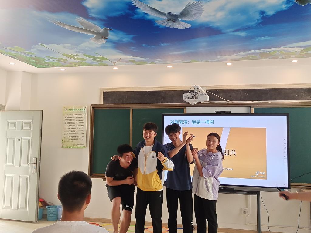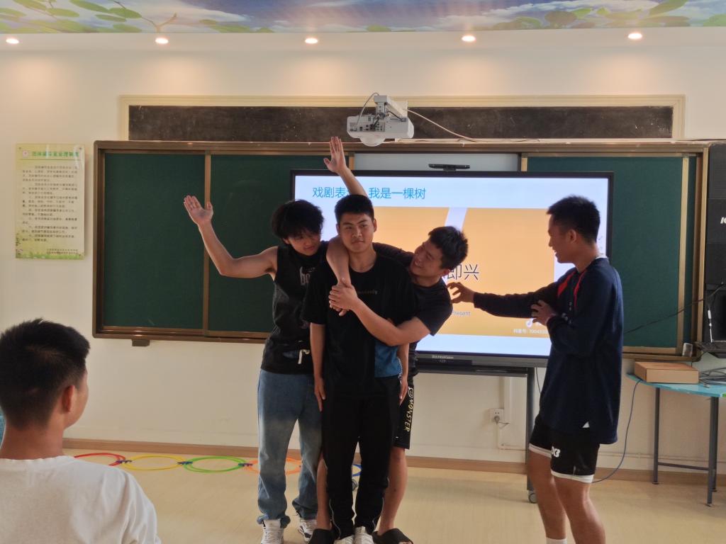 活动正式开始,负责教师为同学们讲解了戏剧表演中的流动塑像、转型塑像、一对对、一页页、自由演绎等表演方式,并让同学们依次上台表演。教师引导同学们通过“我是一棵树”“情绪格子”等戏剧表演游戏进行表演练习,同学们沉浸其中释放情绪,每个小组以自身故事为基础进行了短小的戏剧表演,演绎了战胜困难、解开体考的心结、实现个人目标等故事。表演完毕后,教师对同学们的表演给予了积极的反馈和支持,对于表演中所呈现的主题、情感和挑战进行了深入的探讨和分享,并鼓励表演者分享表演背后的情感和体验。