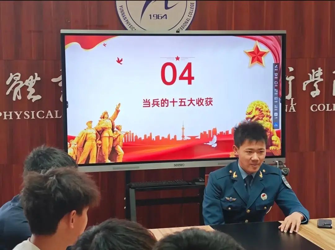 本次活动邀请到了优秀退役大学生士兵——运动训练学院2024级运动训练5班的刘安发同学,该生是云南昭通人、汉族、中共党员。2019年9月他光荣入伍,于2024年9月退伍,服役时长达五年,曾在中国人民解放军陆军某旅服役。服役期间,刘安发担任过班长、尖兵集训队队长,参加过两次大型演习、两次海训任务及军事大比武等活动。他在部队中表现优异,获得众多荣誉,包括一次个人三等功、两次“四有”优秀士兵、两次强军兴训先进个人、军事训练尖兵、三次嘉奖,并获得军事体育特级证书,此外,他还是优秀司号教练员、优秀游泳教练员。