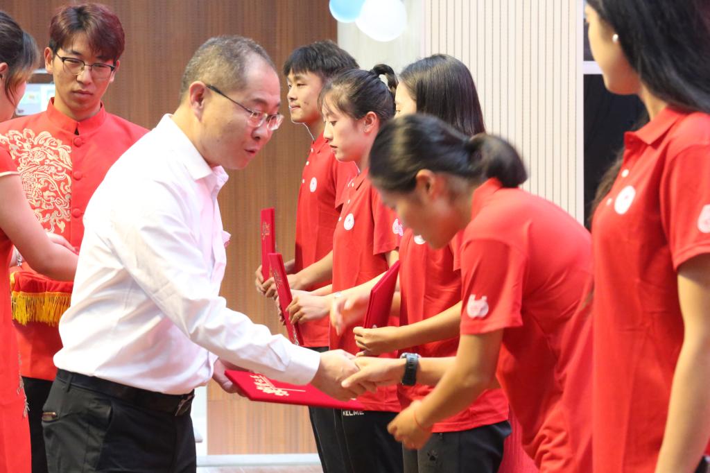 党委书记缪军为获奖学生代表颁发“大学生体质健康优秀等级证书”
