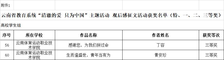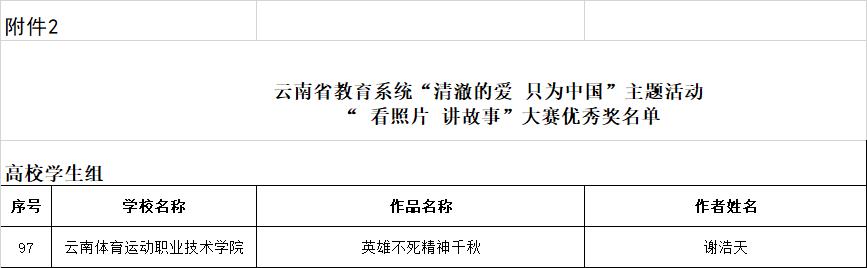 2022年10月19日,云南省教育厅发布了《云南省教育厅关于发布全省教育系统结果的通知》,YABO鸭脖官网学生工作部(处)选送的学生作品喜获佳绩。丁容同学的作品《感谢您,为我们拼过命》以及黄安珍同学的作品《生而逢盛世,青年当有为》在云南省教育系统“清澈的爱 只为中国”主题活动观后感征文活动中荣获三等奖;谢浩天同学的作品《英雄不死精神千秋》在云南省教育系统“清澈的爱 只为中国”主题活动“看照片 讲故事”大赛中荣获优秀奖。