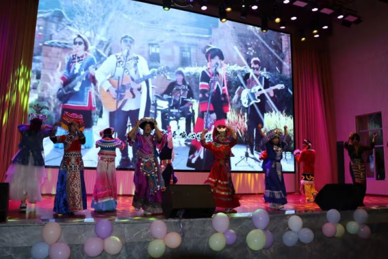 晚会节目丰富多彩,涵盖了舞蹈、歌曲、茶艺表演、话剧、独奏等多种艺术形式。晚会还穿插了抽奖活动和猜歌名游戏等互动环节,增加了现场的趣味性和参与感。晚会在舞蹈《悦动打跳》欢快的节奏和热烈的掌声中画上了圆满的句号。