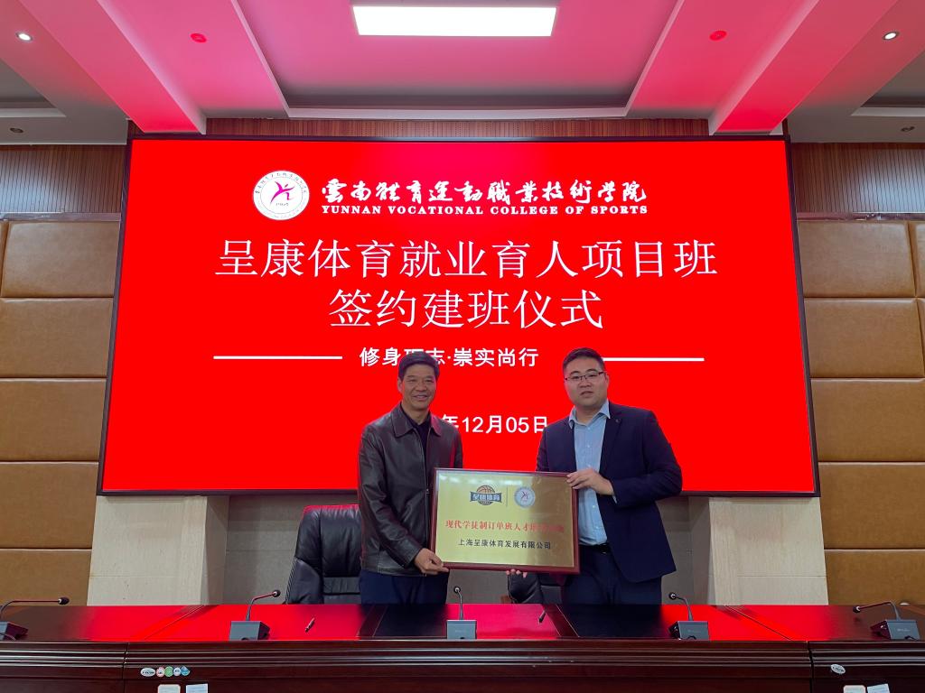 学校领导致欢迎词,对上海呈康体育有限公司的到来表示欢迎;希望在教育部就业育人项目的引领下,双方深入推进产教融合、校企合作,实现毕业生更高质量更充分就业;要求项目班的同学珍惜机会,认真参与,努力学习,全面提升专业能力和实践能力,为未来的职业发展打下坚实的基础。随后,双方举行了签约授牌仪式。